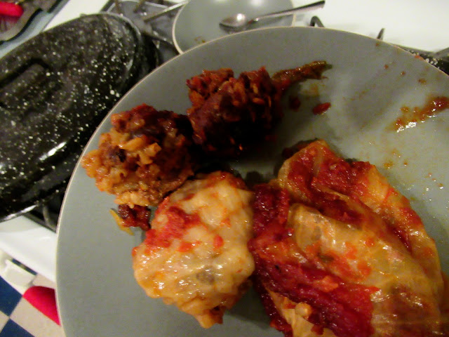 I cooked the cabbage covered on a low slow heat in the oven for several hours lifting the heavy pan in and out of the oven to redistribute the juices and to be sure that the rice was actually fully cooked.