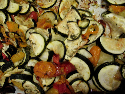 zucchini, tiny tomatoes, and tiny peppers roasted with olive oil, fresh lemon juice, black pepper, dill and lemon peel. I snitched one slice of zucchini from the pan. it took a great deal of self-control to not consume the entire contents of the pan. I plan to serve the cooked vegetables over romaine lettuce.